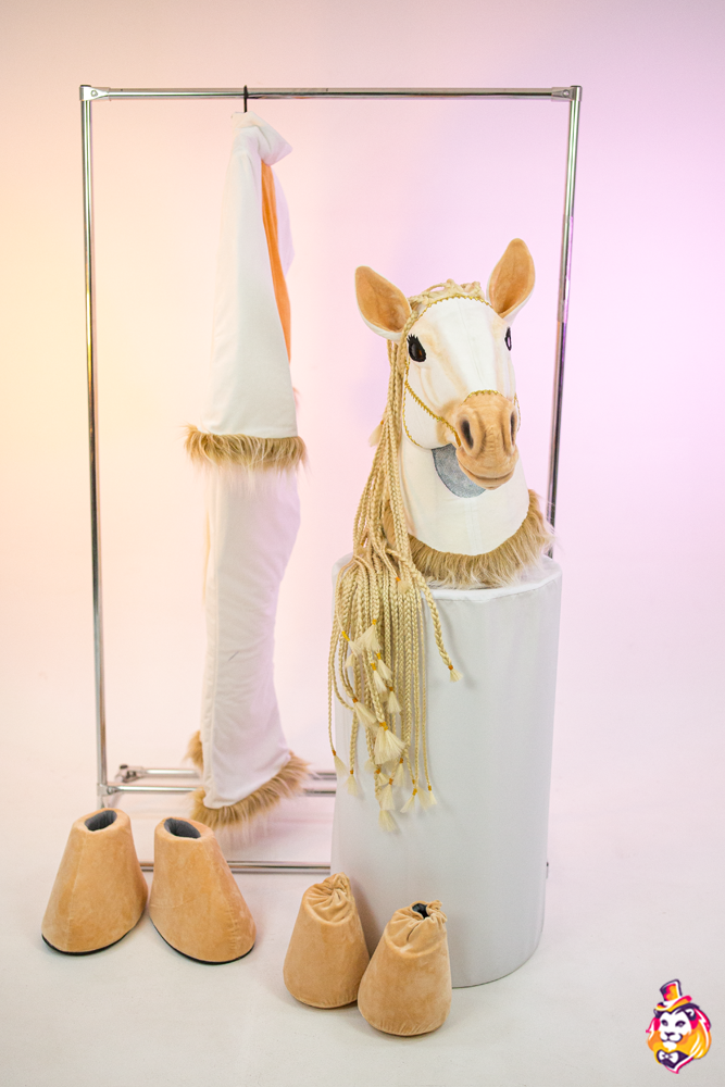 Комплектация:Голова - поролоновый каркас, обтянутый тканью; смотровая область в шее; доп. вентиляционного отверстия нет. Туловище - комбинезон, пара копыт и пара обуви (поролоновый каркас, обтянутый тканью) |